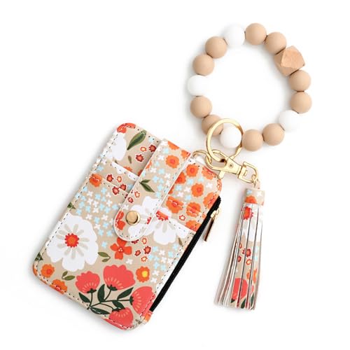 Porte-clé bohème pour femme avec bracelet en perles et pompon, kaki, 12cm/4.72in x8.5cm/3.35in, Mode