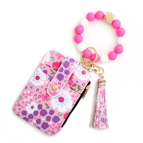 Porte-clé bohème pour femme avec bracelet en perles et pompon, rose, 12cm/4.72in x8.5cm/3.35in, Mode