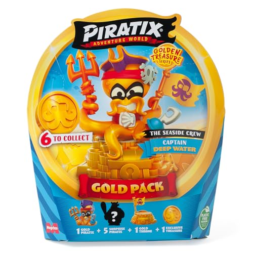 PIRATIX Golden Treasure - Gold Pack The Seaside Crew. Comprend 5 Piratix Surprise, 1 trésor Exclusif, 1 Drapeau Exclusif, 1 Podium, 6 Accessoires et Le Capitaine doré Deep Water