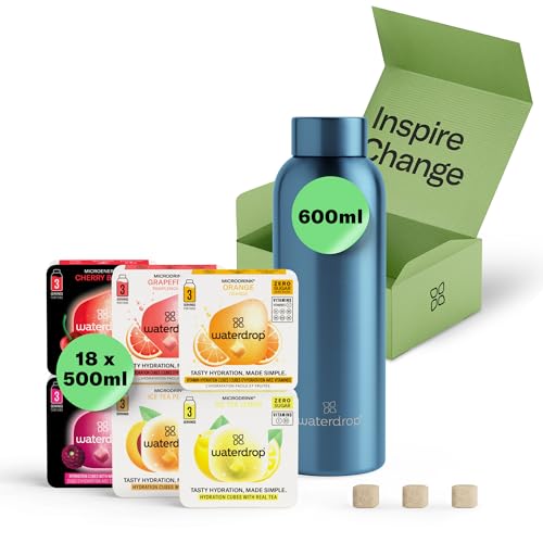 waterdrop® Coffret Dégustation Inox - Bouteille Isotherme 600ml + 18 Cubes à Boire en 6 Saveurs, Boisson en Cube avec Vitamine C & Vitamine B, Sans Sucre, Gourde d'Eau, Coffret Cadeau Femme & Homme