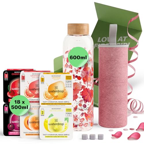 waterdrop® Coffret Dégustation Verre - Bouteille en Verre 600ml + 18 Cubes à Boire en 6 Saveurs, Boisson en Cube avec Vitamine C & Vitamine B, Sans Sucre, Gourde d'Eau, Coffret Cadeau Femme & Homme