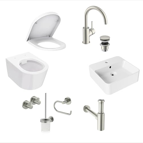 Lenz Perfect Fit 41050011 Kit de salle de bain pour invités 8 pièces en acier inoxydable – WC mural avec abattant WC avec système d'abaissement automatique, lavabo, robinet économique, siphon et kit