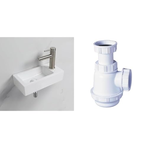 Ibergrif M41102-R, Lavabo Lave Main Blanc Rectangulaire en Céramique Suspendu pour Salle de Bains et WC & Wirquin SP3178 Siphon de lavabo et lave-mains à culot court, blanc