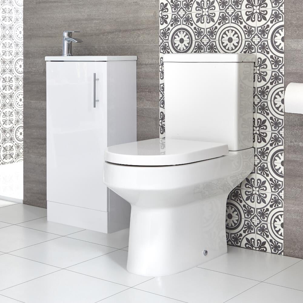 Pack WC à poser sans bride avec lave-mains intégré, abattant déclipsable et frein de chute, sortie horizontale, blanc, effet Vortex, GoodHome Cavally