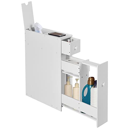 GIANTEX Petit Meuble Salle de Bain 16 cm, Armoire Salle de Bain Étroit, Porte-Papier, Meuble WC Compact avec Tiroirs, Panneau MDF, Rangement Toilette pour Petit Espace (Blanc, 48 x 16 x 58 cm)