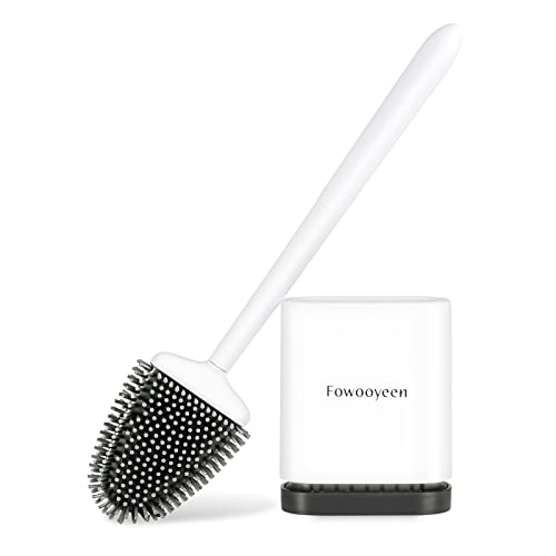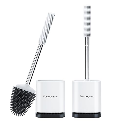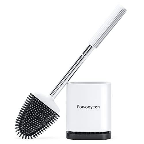 Fowooyeen Brosse WC Silicone, Brosse de Toilette Silicone et Support, Balayette WC Suspendu à Séchage Rapide avec Manche en Acier Inoxydable, Balai Toilette Salle de Bain, Autoportant/Mural, Blanc