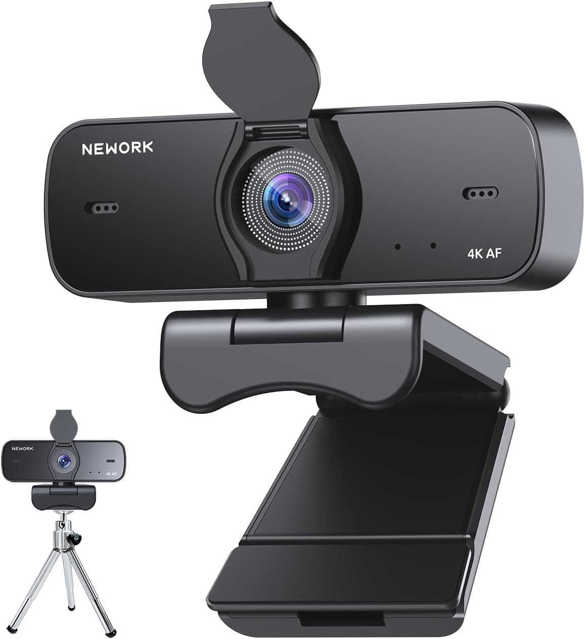 NEWORK Webcam 4K pour PC, 4K UHD 1/2.55" Capteur Sony, Auto Focus, Couverture de confidentialité et trépied, Double Microphone avec Annulation du Bruit, Plug&Play 77° FOV, Webcam pour Streaming