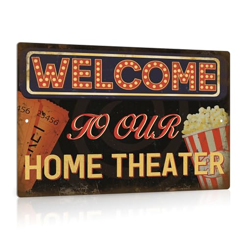 Putuo Decor Panneau de cinéma, décoration murale vintage pour bar, cafés, pubs, salle de médias, 30,5 x 20,3 cm, panneau en aluminium (Welcome to Our Home Theater)
