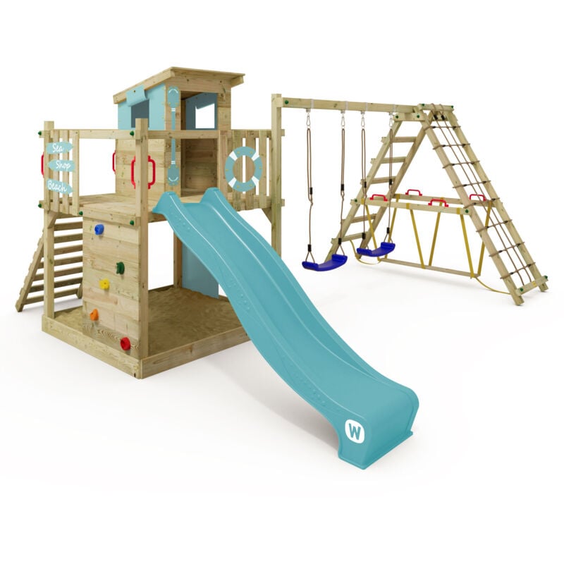 WICKEY Tour de jeux Smart Camp avec balançoire & toboggan, cabane avec bac à sable, échelle d'escalade & accessoires de jeu - bleu pastel
