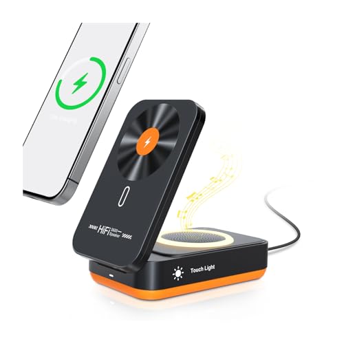 3-en-1 Wireless Charger Compatible avec iPhone 17/16/15/14/13/12 Pro Max, avec Haut-Parleur Bluetooth, Éclairage 3 Niveaux & Support Téléphone Pliable Noir