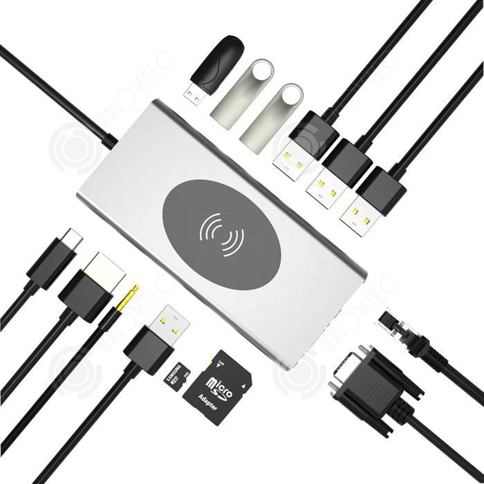 INN Station daccueil 15 en 1 typec+hdmi+yga+pd+rt45+us3.0x3+usb2.0x4+sd+if+3.5 audio+wireless charging port réseau 1000m rt45 gris