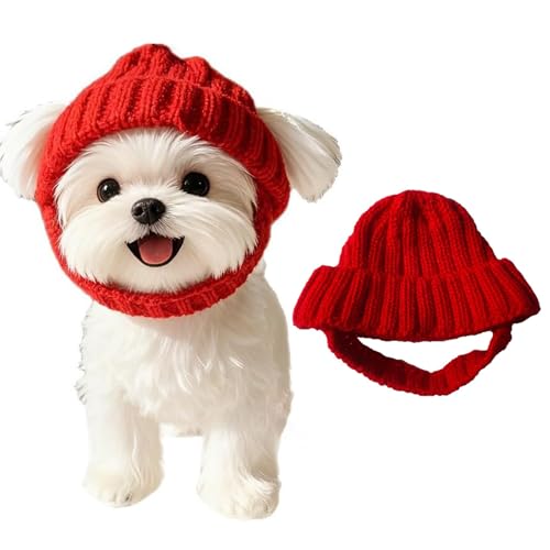 Red Wool Knit Dog Beanie with Ear Flaps – Warm Winter Hat, Washable Pet Christmas Outfit, Cozy Stretchy Knit Hats for Small Dogs, Funny Cute Crocheted Dog Snood for Indoor and Outdoor Use (Red*C)