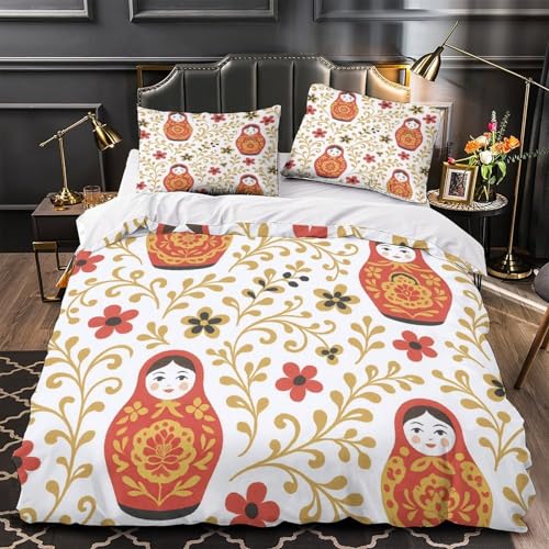 VOXYTMLWG Matryoshka Dolls Parure de Lit Microfibre 3D Imprimée 3 Pièces Éclair Super Douce Russian Folk Housse de Couette Hypoallergique Entretien Facile for Adolescent Single(135x200cm)