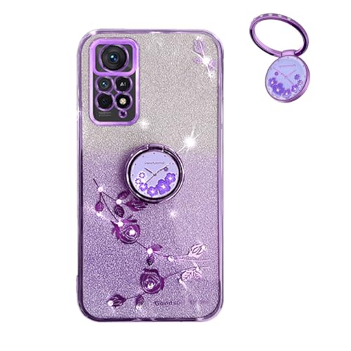 YUECXIN Coque Paillettes pour Xiaomi Redmi Note 11S 4G/ Redmi Note 11, Très Mince Antichoc TPU Bumper Doux Silicone Housse, Délicat Mode Fleurs Ring Holder Stand Bling Femmes Filles Étui. Violet