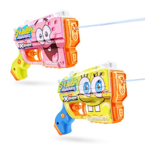 XSHOT WaterBob l'Eponge Junior Fast Fill Pistolet à Eau (Lot de 2) de ZURU – Pistolet à Eau Taille Enfant avec Design Bob l'Eponge, Technologie Fast Fill, Portée 9m et Réservoir 150ml