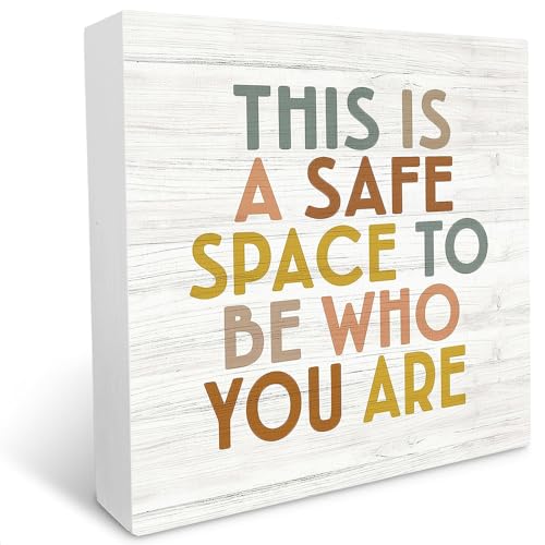 Panneau en bois inspirant « This Is A Safe Space To Be Who You Are » - Décoration de bureau pour la maison, la chambre à coucher, le salon, le bureau, l'étagère, la table - 17,8 x 17,8 cm