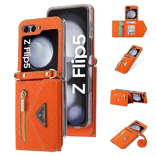 Jeelar ESONG Coque pour Samsung Galaxy Z Flip 5 5G,Cuir PU de qualité supérieure,avec Sangle réglable&Fente pour Carte&Fonction Stand-Orange