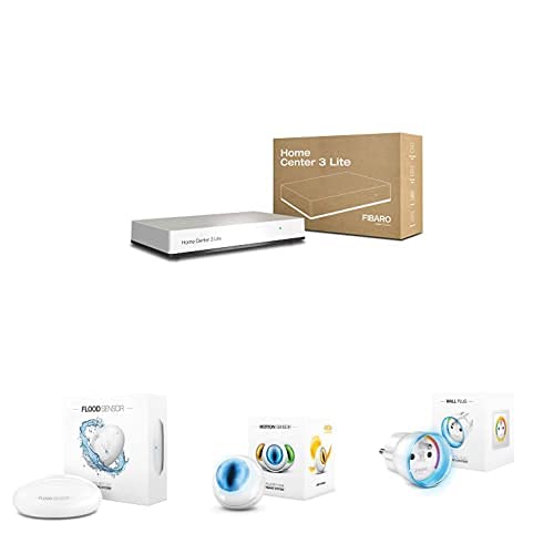 FIBARO Contrôleur domotique Z-Wave+ Home Center 3 Lite HC3L-001 + Flood Sensor/Détecteur d'inondation + Motion Sensor/Détecteur de Mouvement Multifoncions + Wall Plug/Prise Intelligente Type E